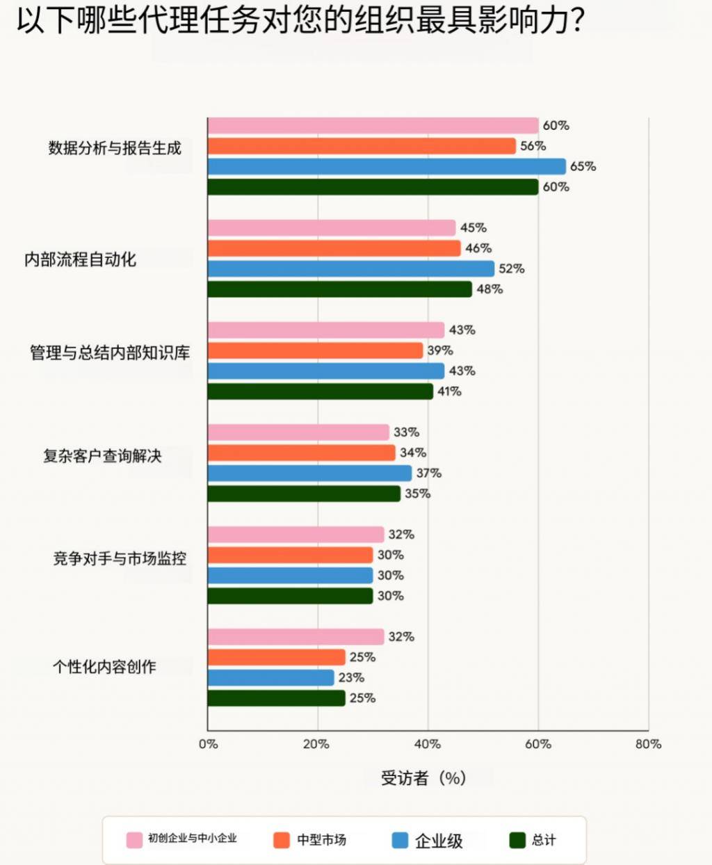 从而使投资报答率可权衡。而这些最终会使各类规模的组织都从中受益。则来自于削减人工投入和避免价格昂扬的错误。65% 的企业认为这些是高影响力的使用。而中小企业为 78%。