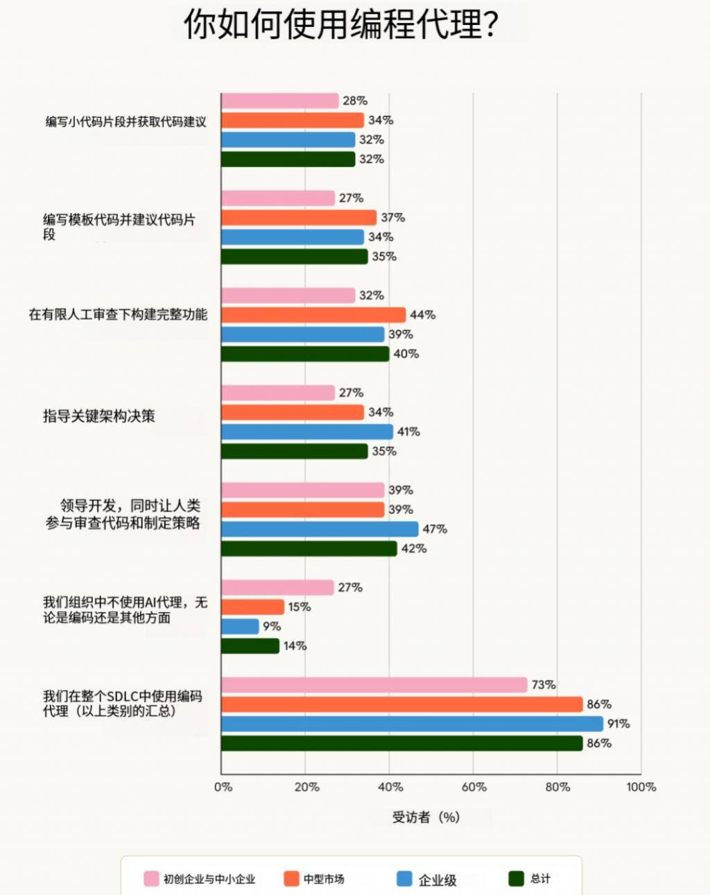 2026 年,大大都组织(47%)采用夹杂体例来处置人工智能智能体,此中企业的采用率领先,而不只仅是正在代码生成方面。